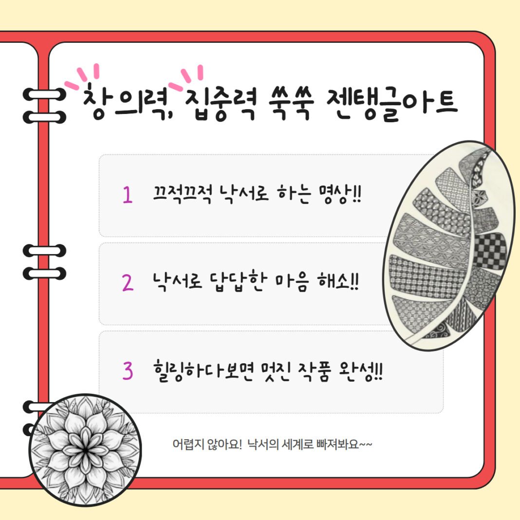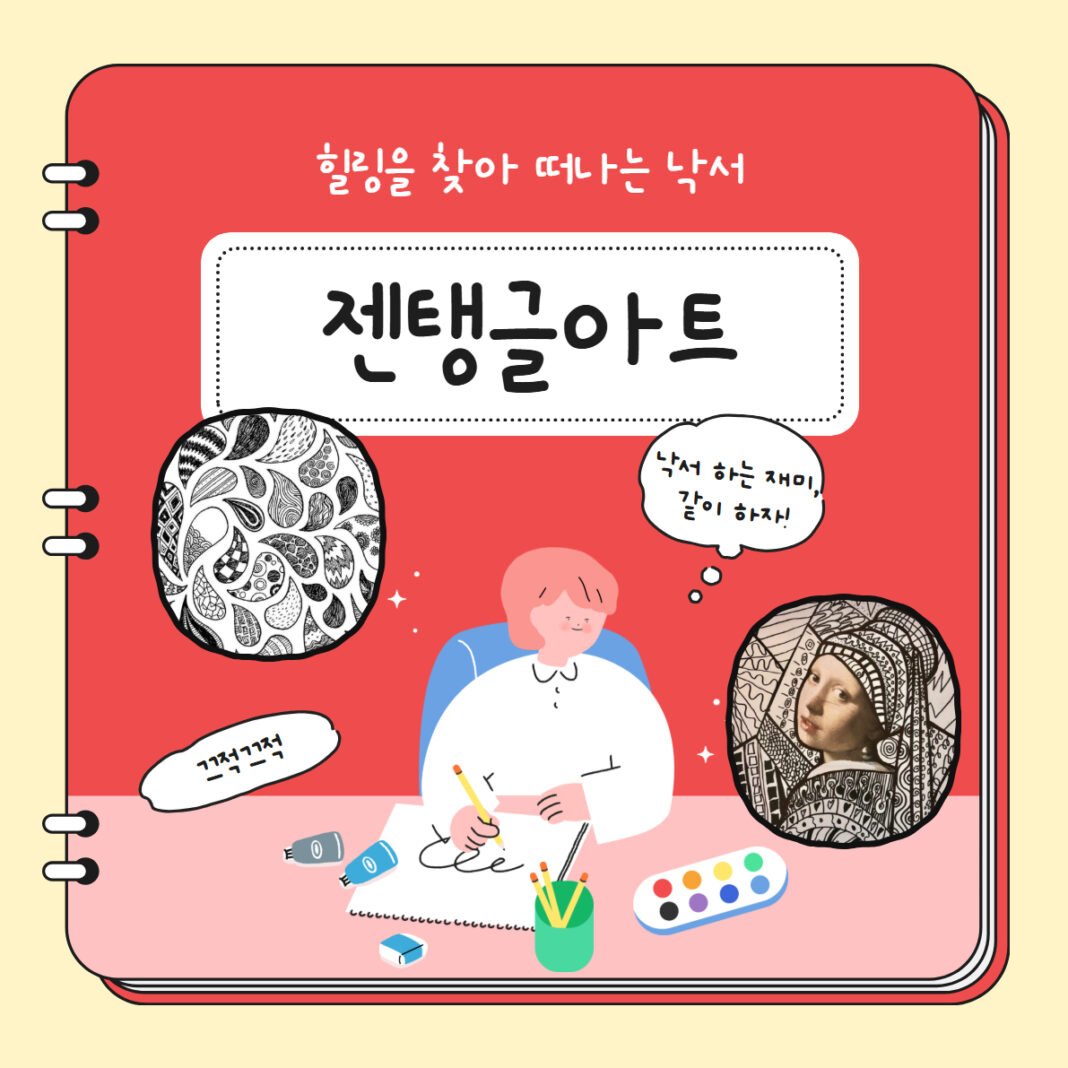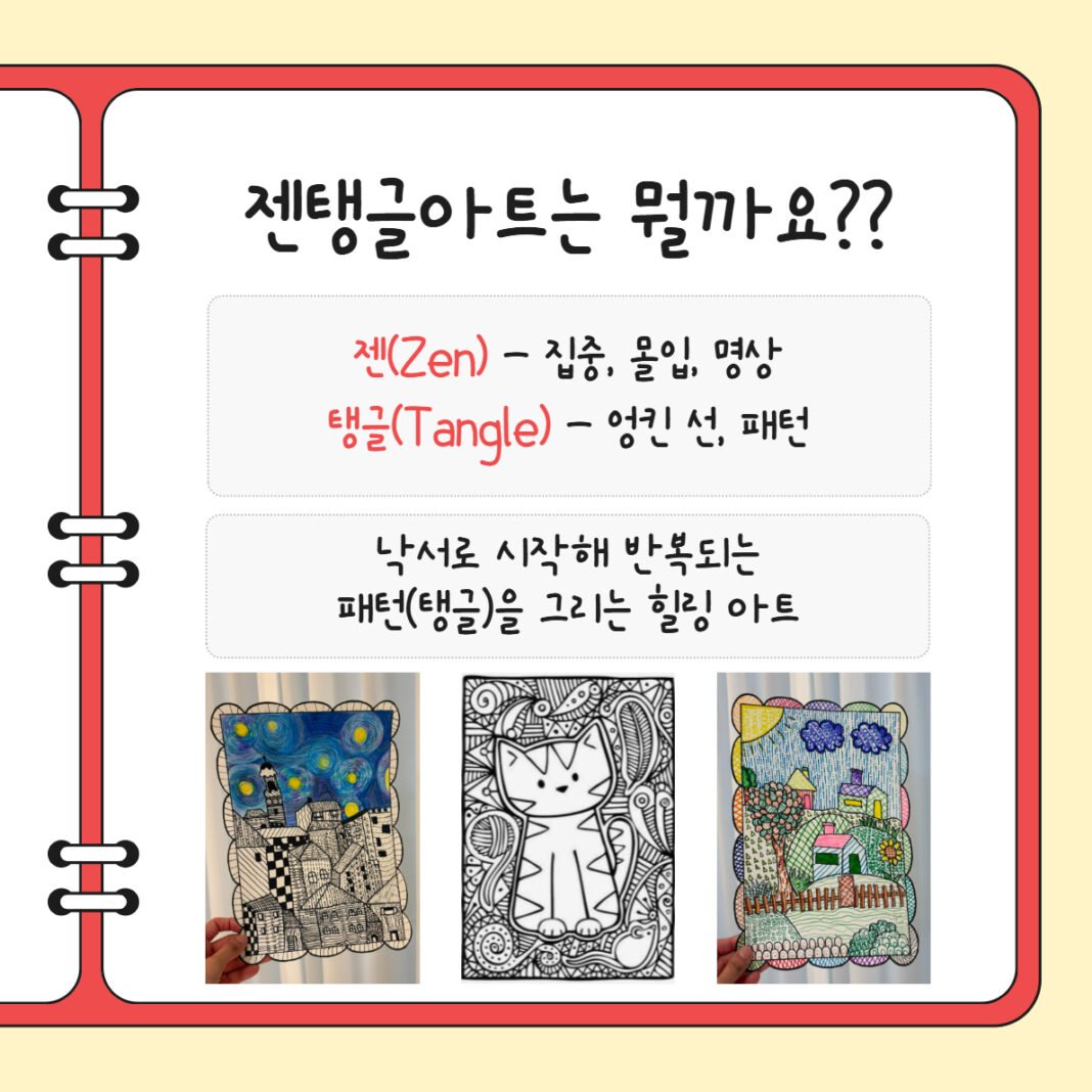 젠탱글아트(Zentangle Art)는 2005년 미국에서 시작된 힐링 예술 프로그램으로, ‘젠(Zen·집중·명상)’과 ‘탱글(Tangle·얽힌 선·패턴)’의 합성어다. 흰 종이에 반복적인 패턴을 그리며 마음의 안정과 집중을 유도하는 예술 활동으로, 특별한 미술 실력 없이도 누구나 참여할 수 있다. 단순한 선에서 패턴이 완성되는 과정에서 스트레스 완화와 집중력 향상 효과가 있어 실제 미술치료 프로그램으로도 활용된다.