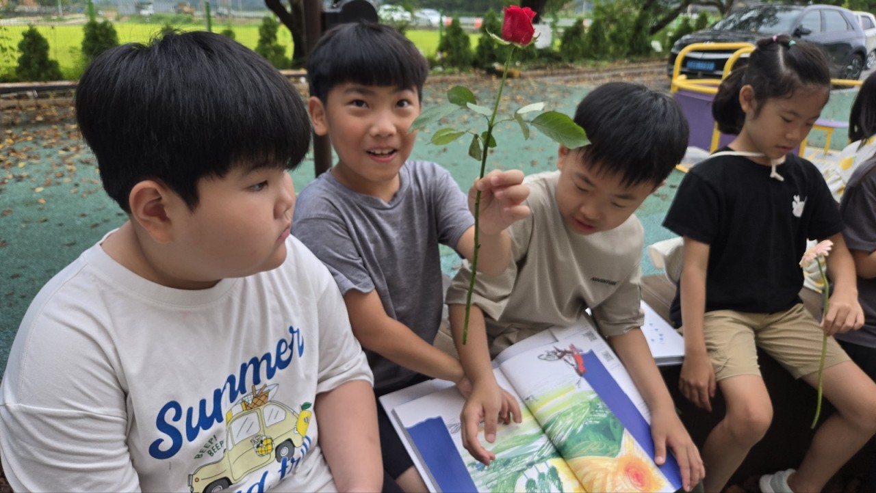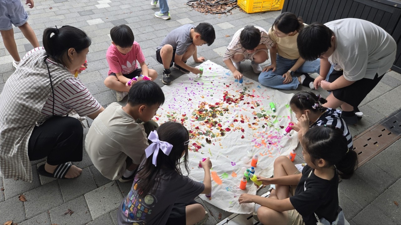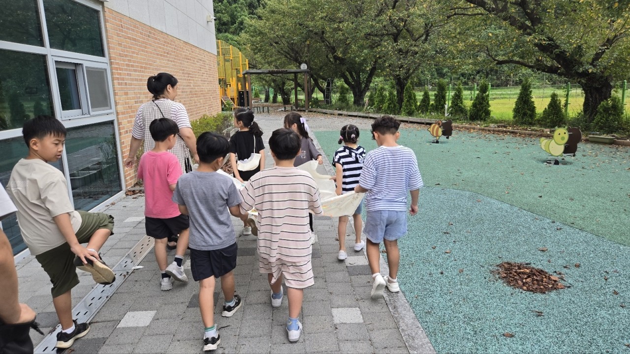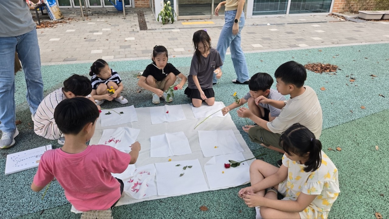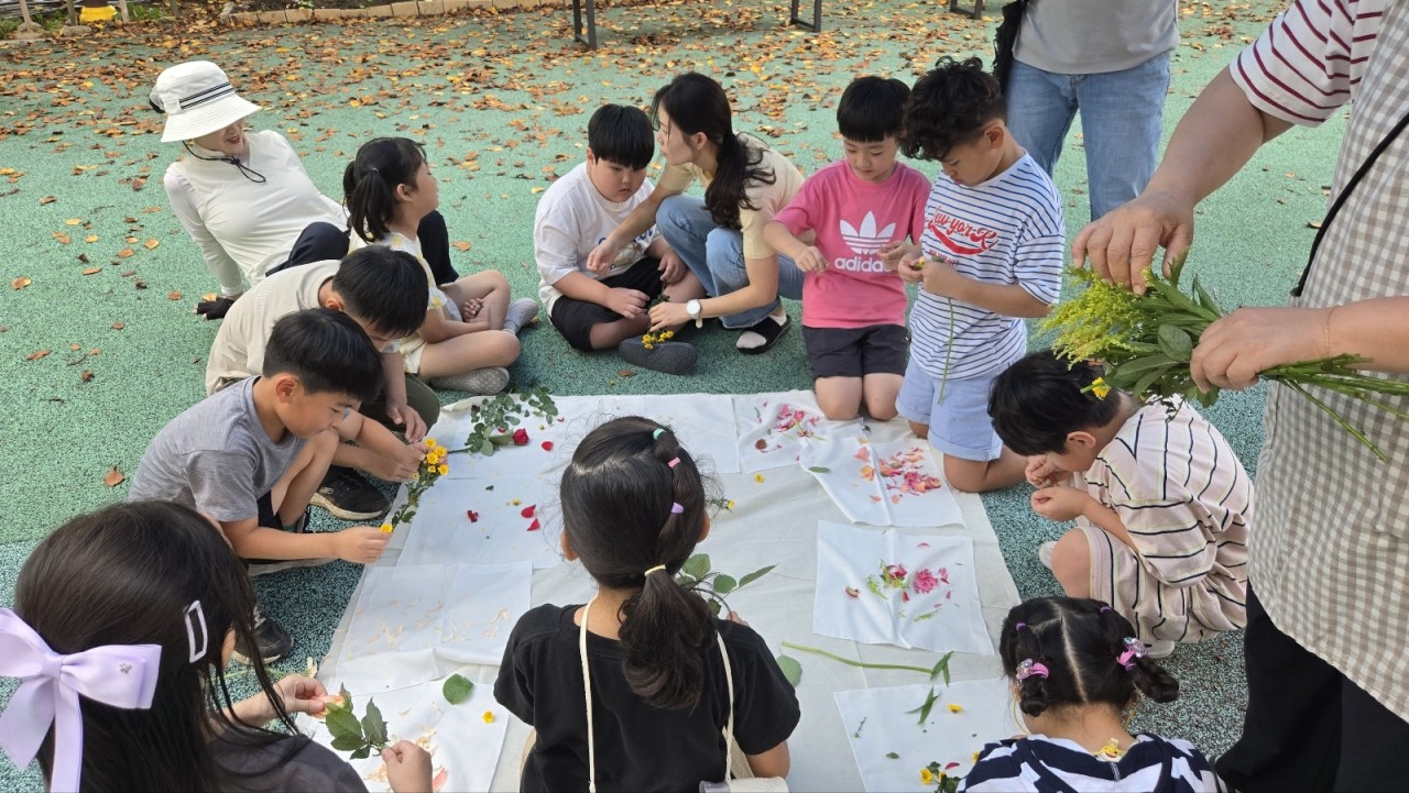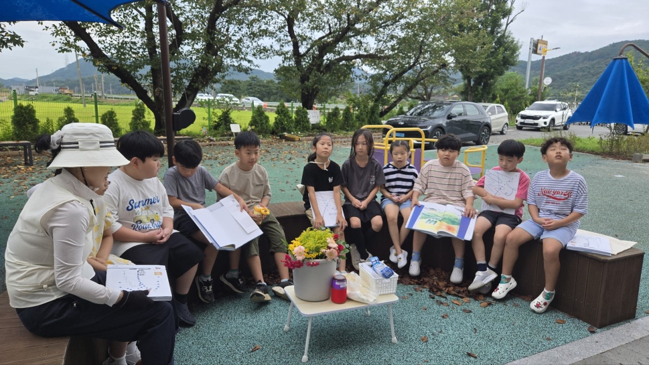 야외 놀이터에 빙 둘러앉은 우리 친구들 뭘 하려는 걸까요?