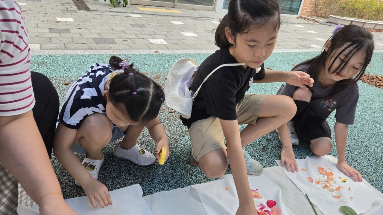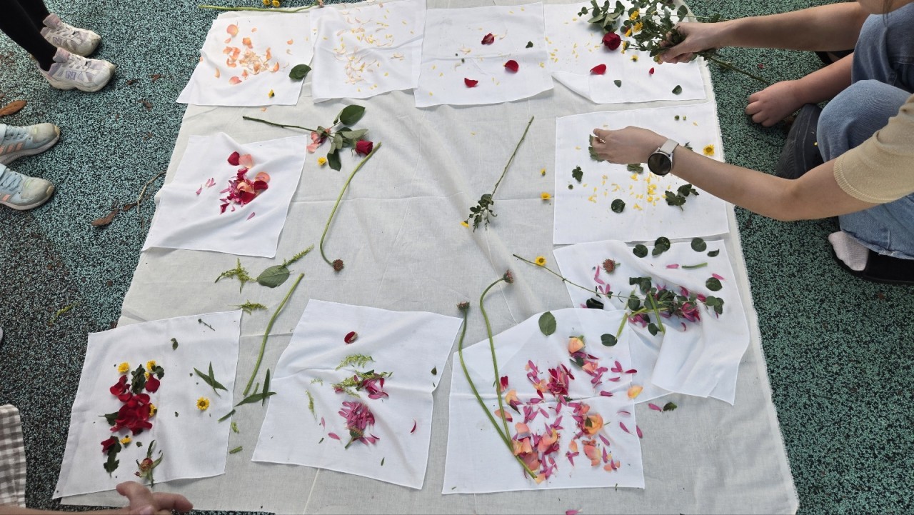 큰 보자기 위에 손수건을 올리고 둘러 앉아 꽃과 잎을 한 장 한 장 떼어 내 손수건 위에 살포시 올려봤어요