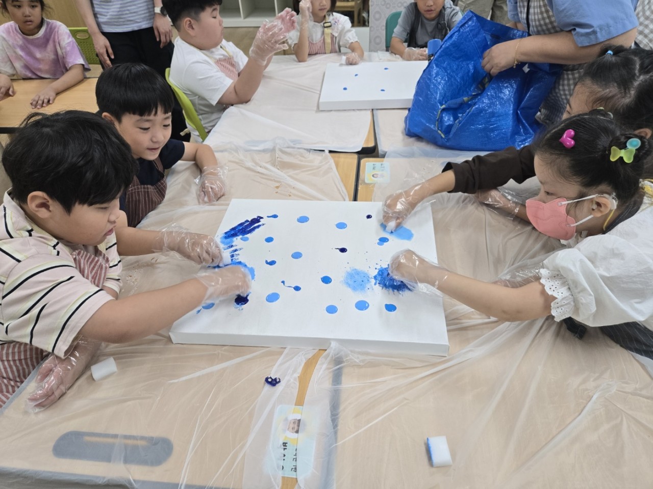 캔버스 액자에 하늘색 물감을 뿌리고 스펀지로 톡톡~ 두드려봅니다