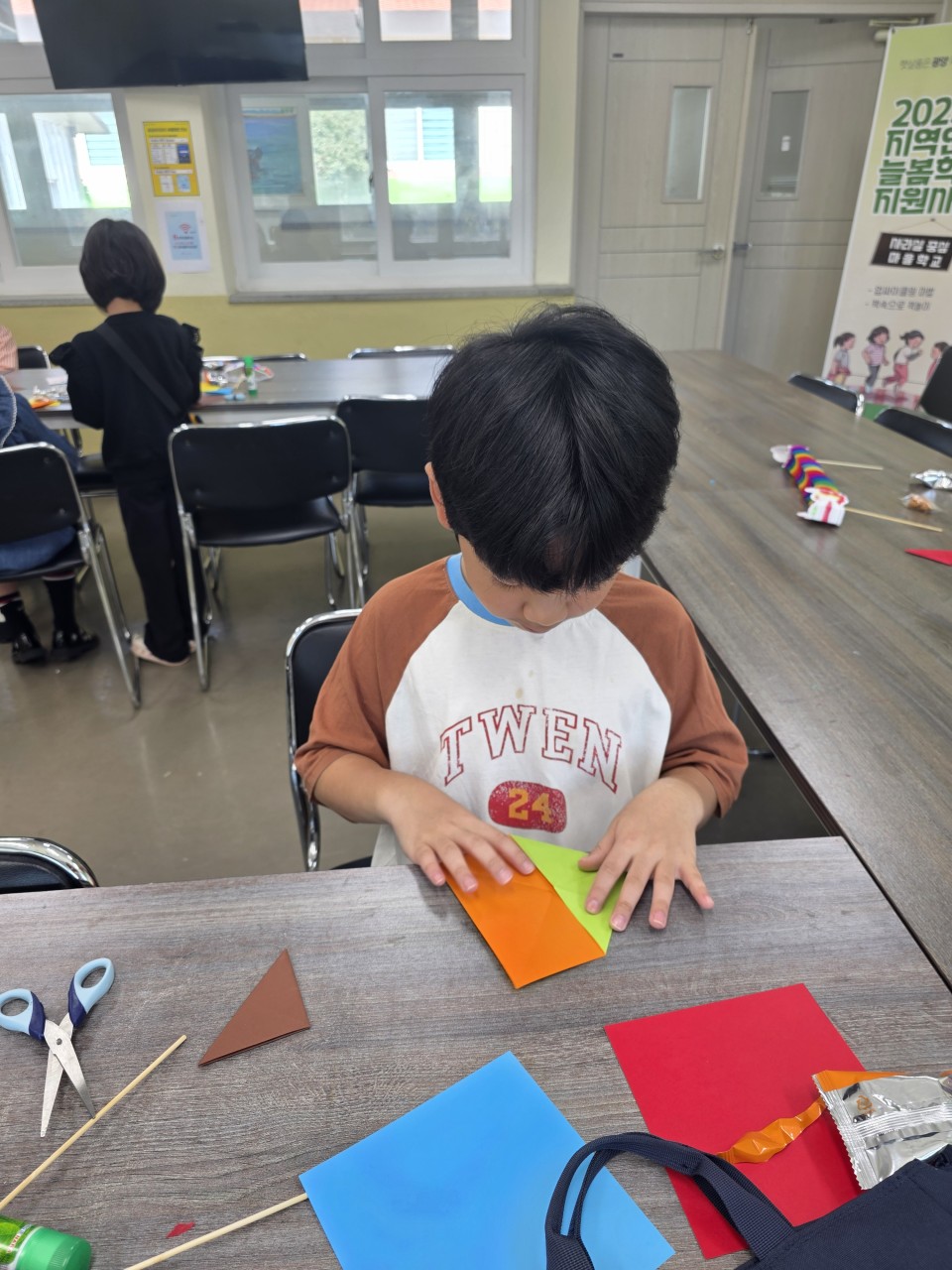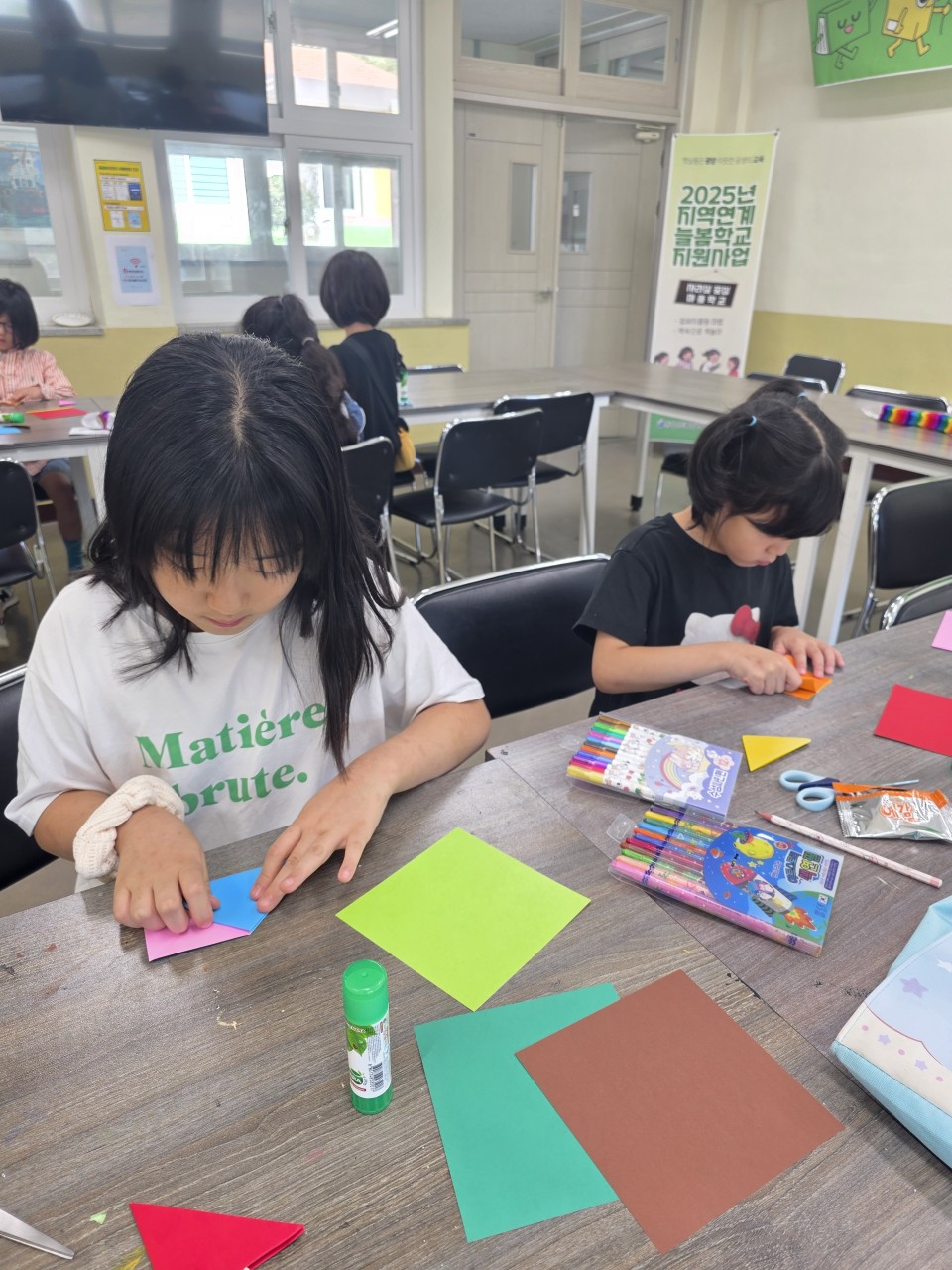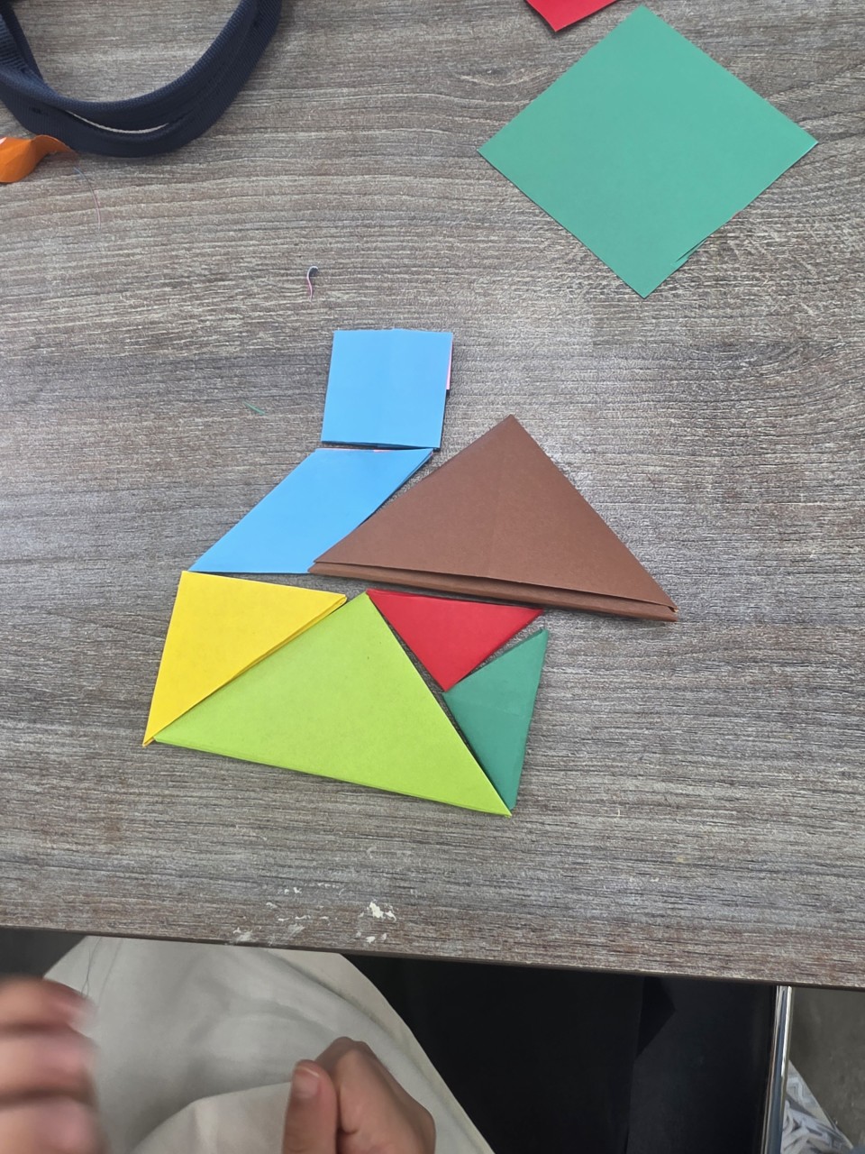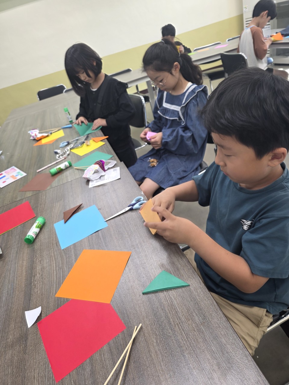 아이들이 직접 색종이로 칠교 조각을 접고 도안에 맞춰 모양을 완성하는 과정을 통해